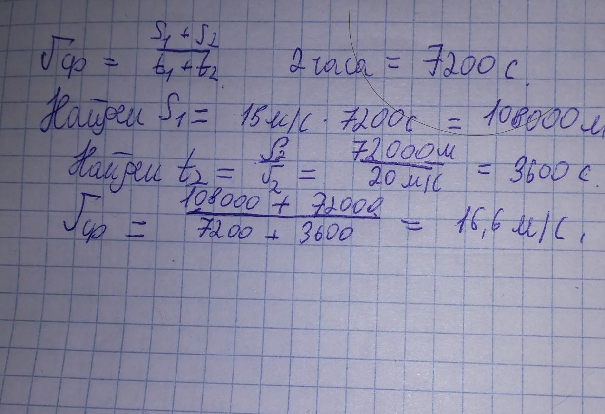 Автомобиль 2 часа двигался со скоростью 15м/с, а затем он проехал ещё 72км со скоростью 20м/с. Какова его средняя скорость на всем пути?