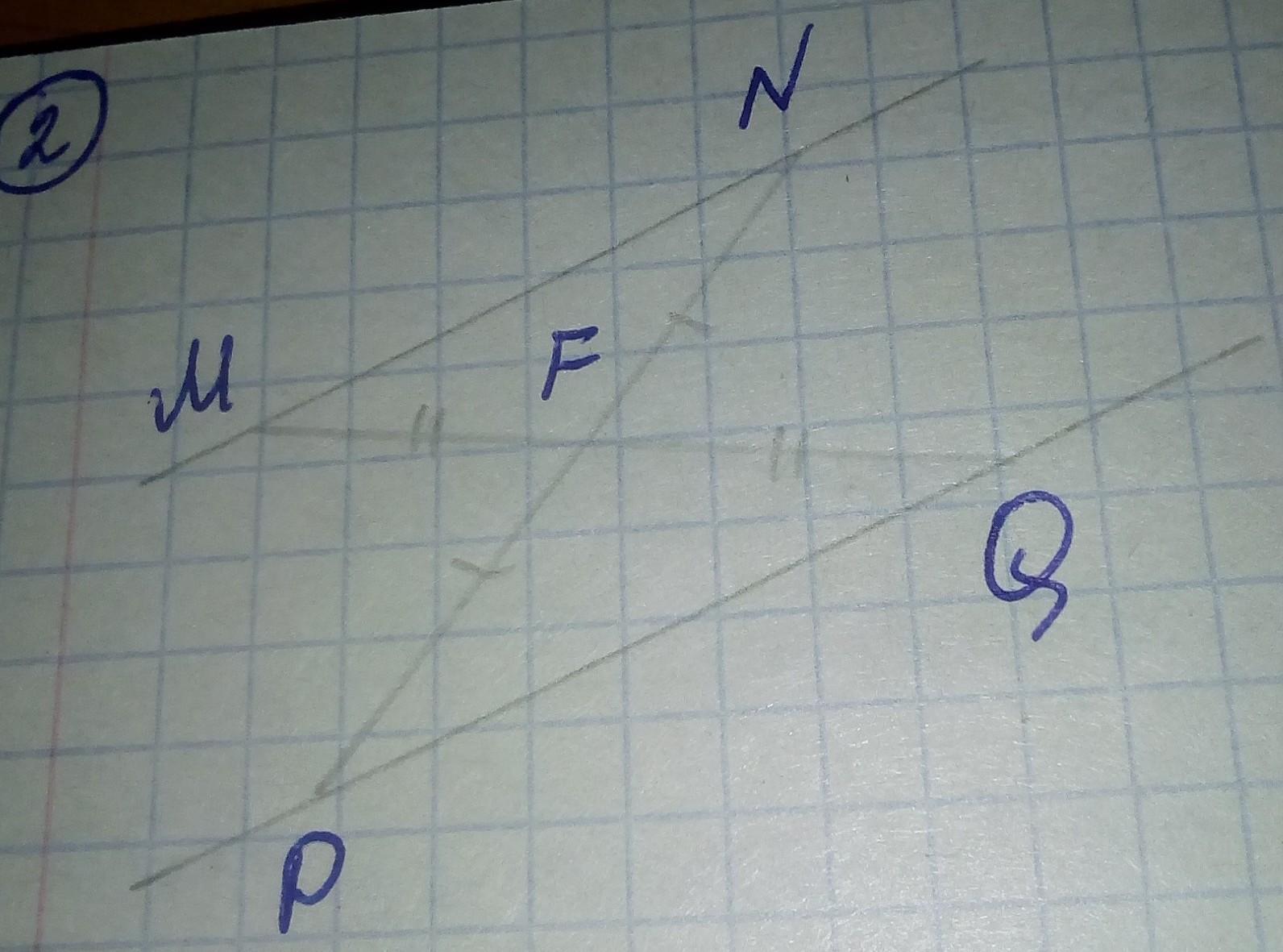 Т.к. PF=FN, MF= FQ, а угол MFN= углу PFQ как вертикальные, то тр.MFN=тр.QFP по 1 признаку.