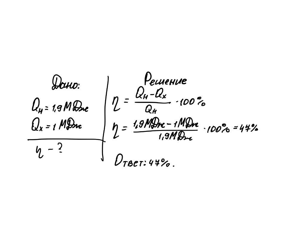 В процессе работы тепловой машины за некоторое время рабочим телом было получено от нагревателя количество теплоты 1,9 МДж, передано холодильнику 1 МДж. Определи КПД тепловой машины.