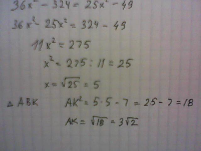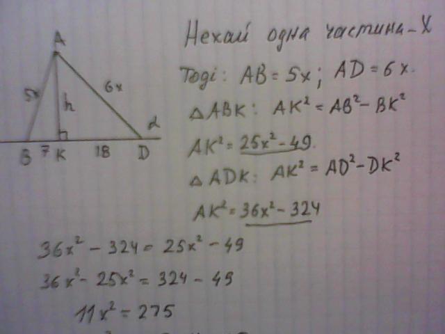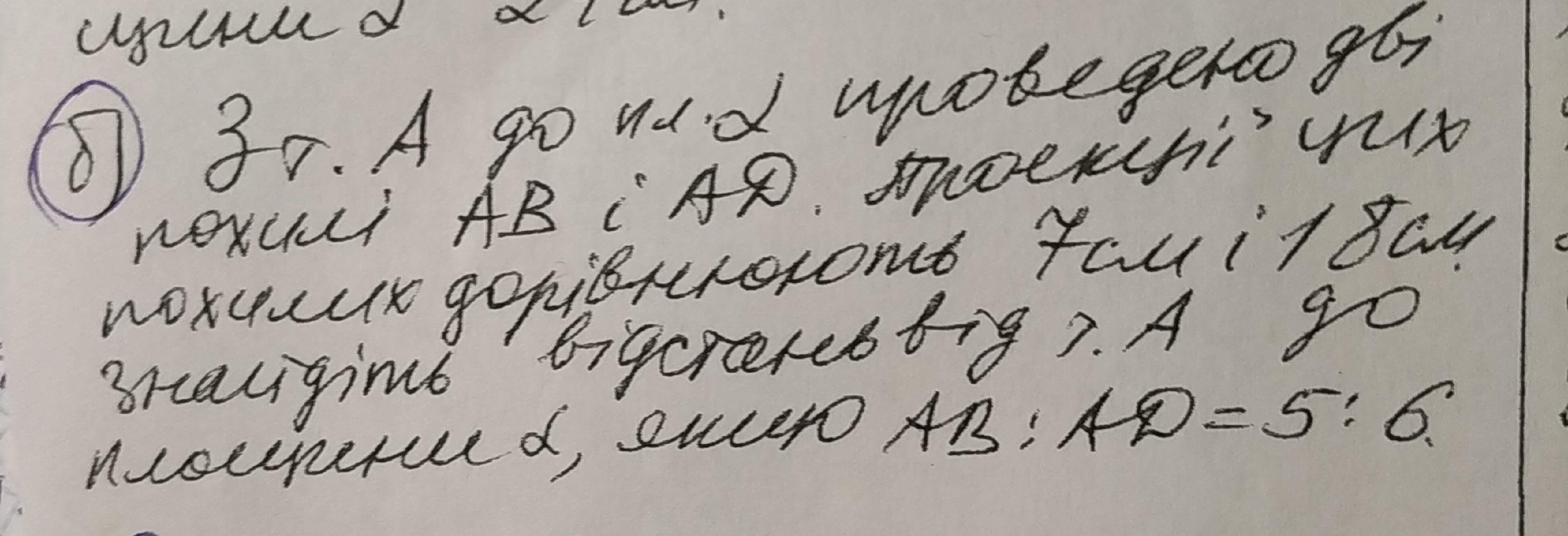 З т. А до площини альфа проведено дві похилі АВ і АD. Проекції цих похилих дорівнюють 7 см. і 18 см. Знайдіть відстань т.А до площини альфа, якщо АВ : АD=5:6. Можно пожалуйста с рисунком