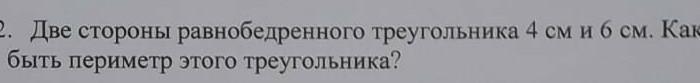 Если это равнобедренный треугольник, то две стороны у него равны. Это может быть либо треугольник со сторонами 4, 4, 6 либо со сторонами 6,6,4. То есть периметр может быть либо 4+4+6=14, либо 6+6+4= 16см.