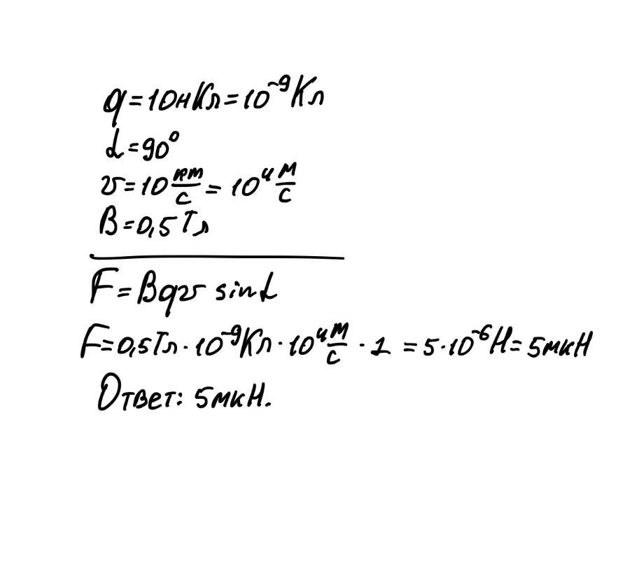 Определите модуль силы, действующей на заряд 10нКл, движущийся в однородном магнитном поле, перпендикулярно линиям индукции магнитного поля со скоростью 10км/с. Модуль индукции магнитного поля равен 0,5 Тл. Ответ дайте в мкН.