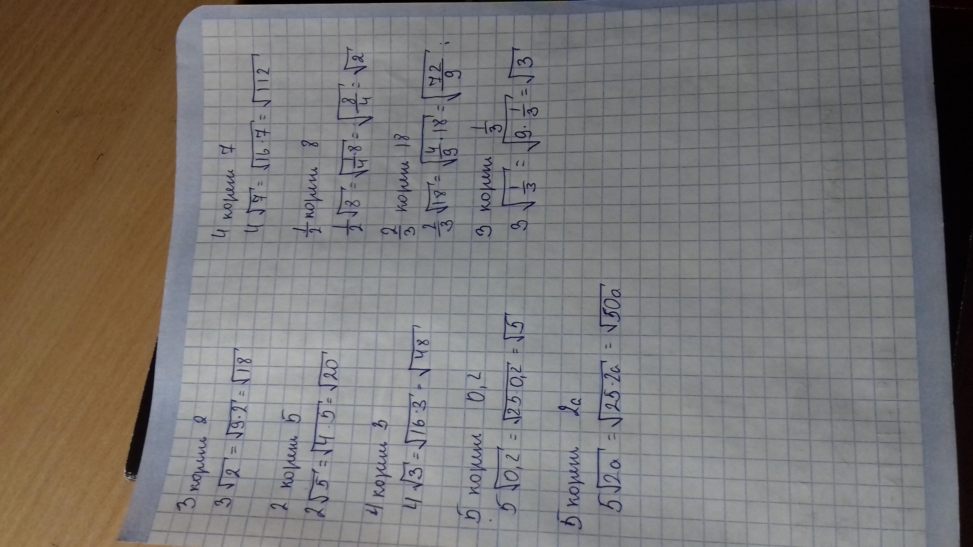 Внесите множитель под знак корня: 3 корень 2; 2 корень 5; 4 корень 3; 4 корень 7; 1/2 корень8; 2/3 корень18; 5 корень 0,2; 3 корень1/3; 5 корень 2а: