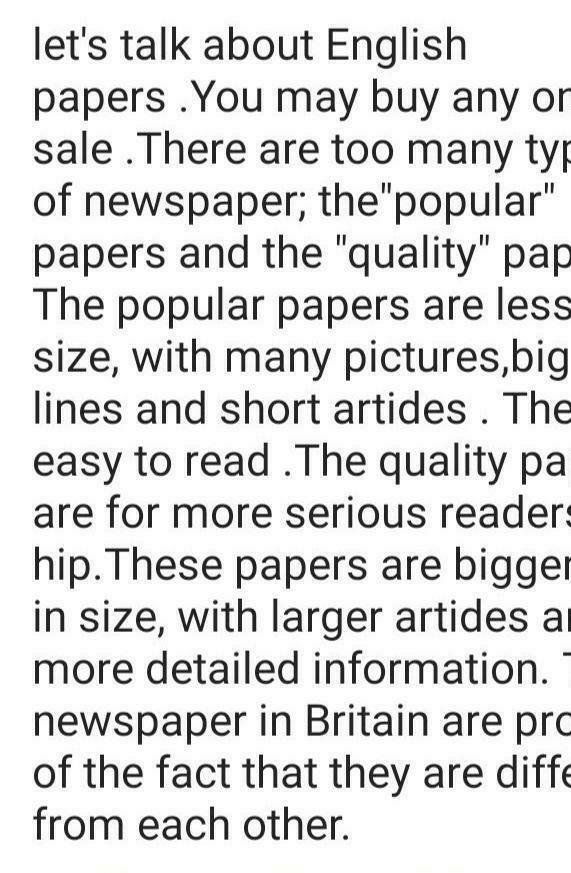 Лэтс толк абаут Инглиш пэйперс. Ю мэй бай эни о сэйл. Зээ а ту мэни тайп оф ньюспэйпе ; зэ попула пэйпес анд зэ кволити пэйпэ. Зэ попула пэйпэс а лес сайз, виз мэни пикче биг лайнс анд шорт артайдс. Зэ изи то рид. Зэ кволити пэйпе а фо мо сириус ридыс хип. Зэс пэйпес а бигэ ин сайз, виз ладж артайдс а мо детэйлд инфомейшн. Зэ ньюспэйпе ин Бритин а про(не видно) оф зэ факт зэт зэй а диферен фром ич азэ
