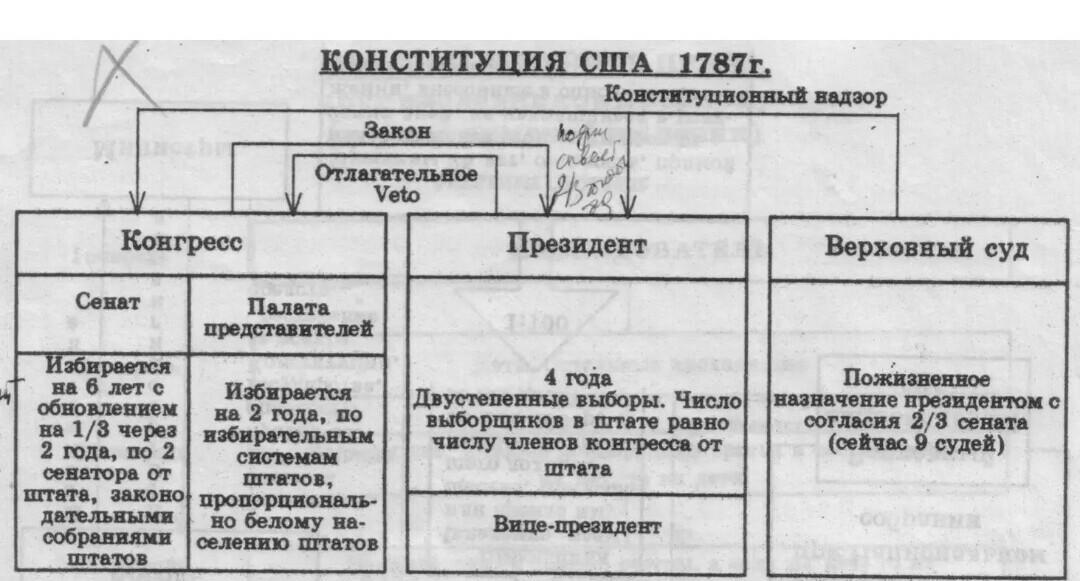 Власть разделяется на 3 ветви 1.1- законодательная, в США это конгресс он состоит из 2 палат 1- Палата представителей, 2- Сенат, 1.2- Исполнительная- главой является президент США он назначает правительство США, 1.3- Судебная это Верховный суд США, по конституции от 1787 года верховные судьи назначаются пожизненно и их 9.