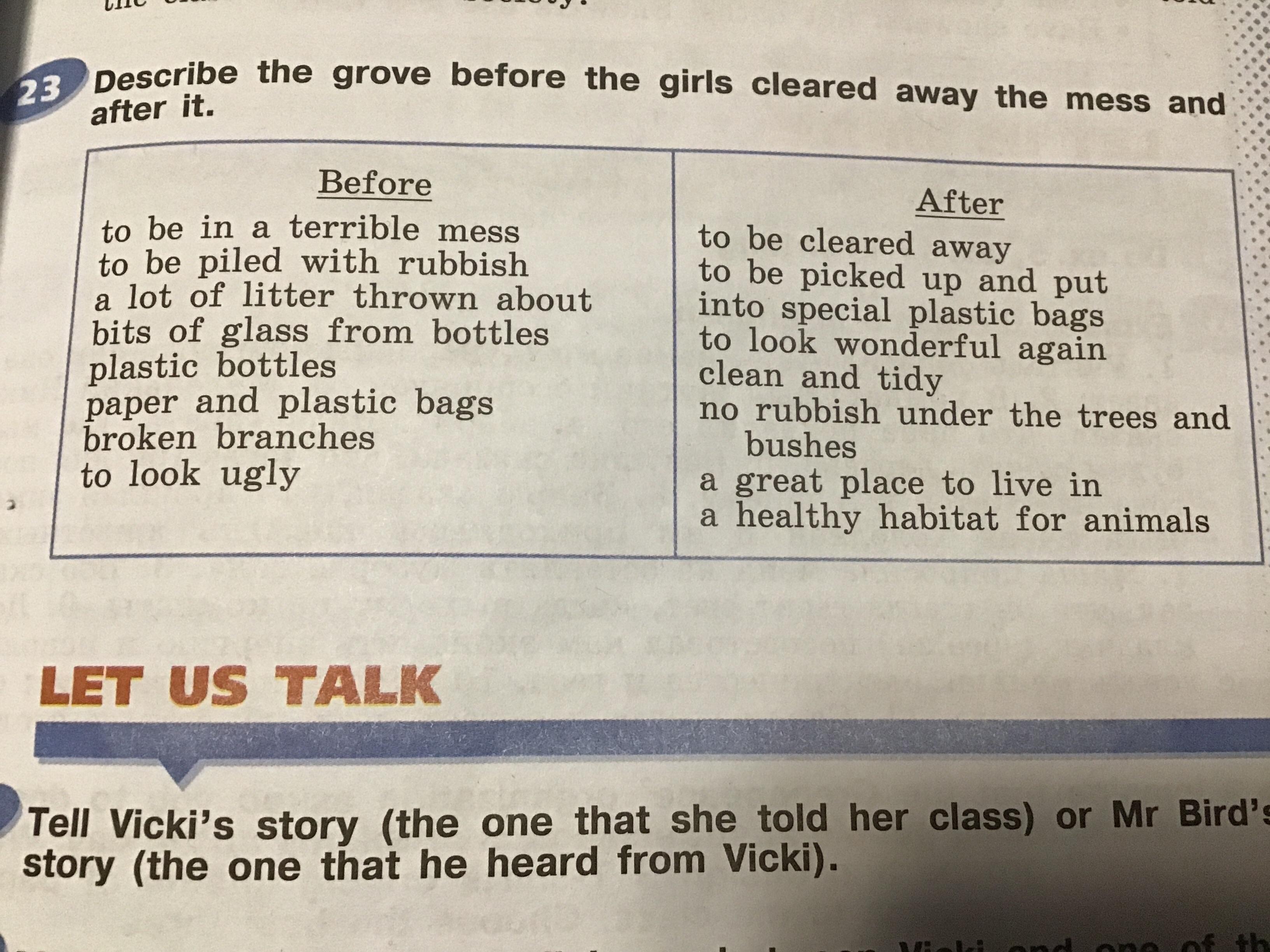 Before they cleared away the garbage, this place was in a terrible mess. It was pilled with rubbish. A lot of litter trown about here, bits of glass from bottles, plastic bottles, paper and plastic bags, brocken branches. This place looked really ugly. So when the girls cleared it away all rubbish was picked up and put into special plastic bags. It became look wonderful again, clean and tidy. There is no rubbish under trees and bushes now. This place turned into great place to live in and healthy habitat for animals.