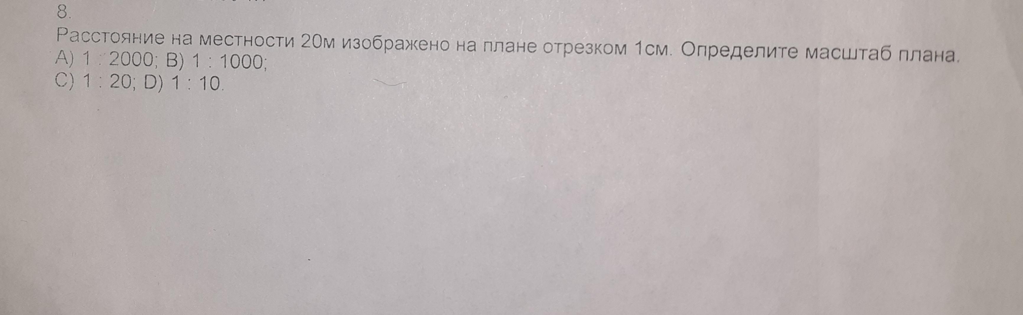 8. Расстояние на местности 20м изображено на плане отрезком 1см. Определите масштаб плана. A)1:200; B)1:1000; C)1:20; D)1:10.
