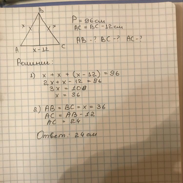 Найдите стороны равнобедренного треугольника периметр которого 96 см а основание на 12 см меньше боковой стороны