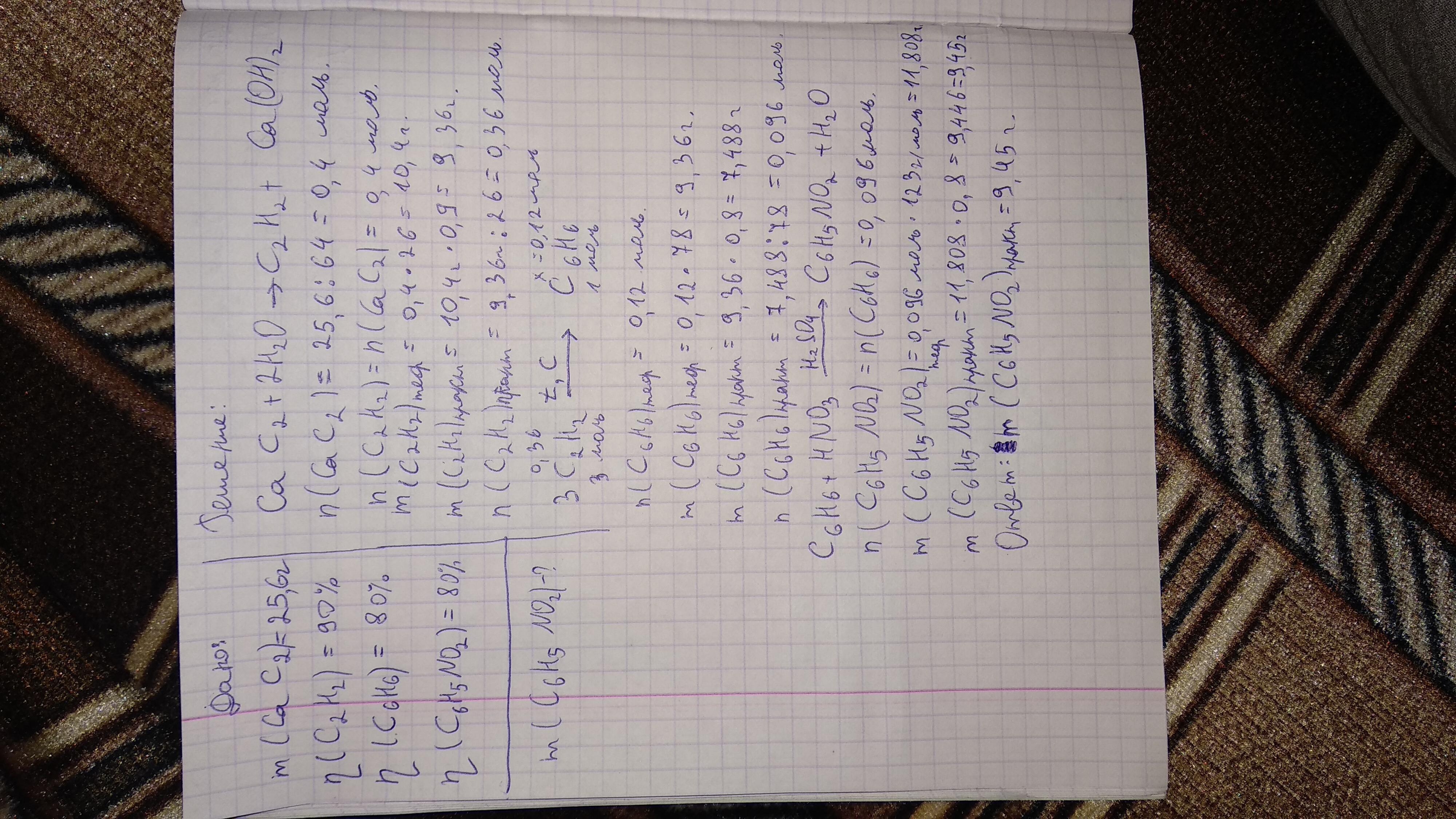 Карбид кальция массой 25,6 г обработали избытком воды и полученный ацетилен подвергли тримеризации. Какую массу нитробензола можно получить из образовавшегося бензола, если выход реакции на первой стадии равен 90%, на второй – 80% и на третьей – 80%?