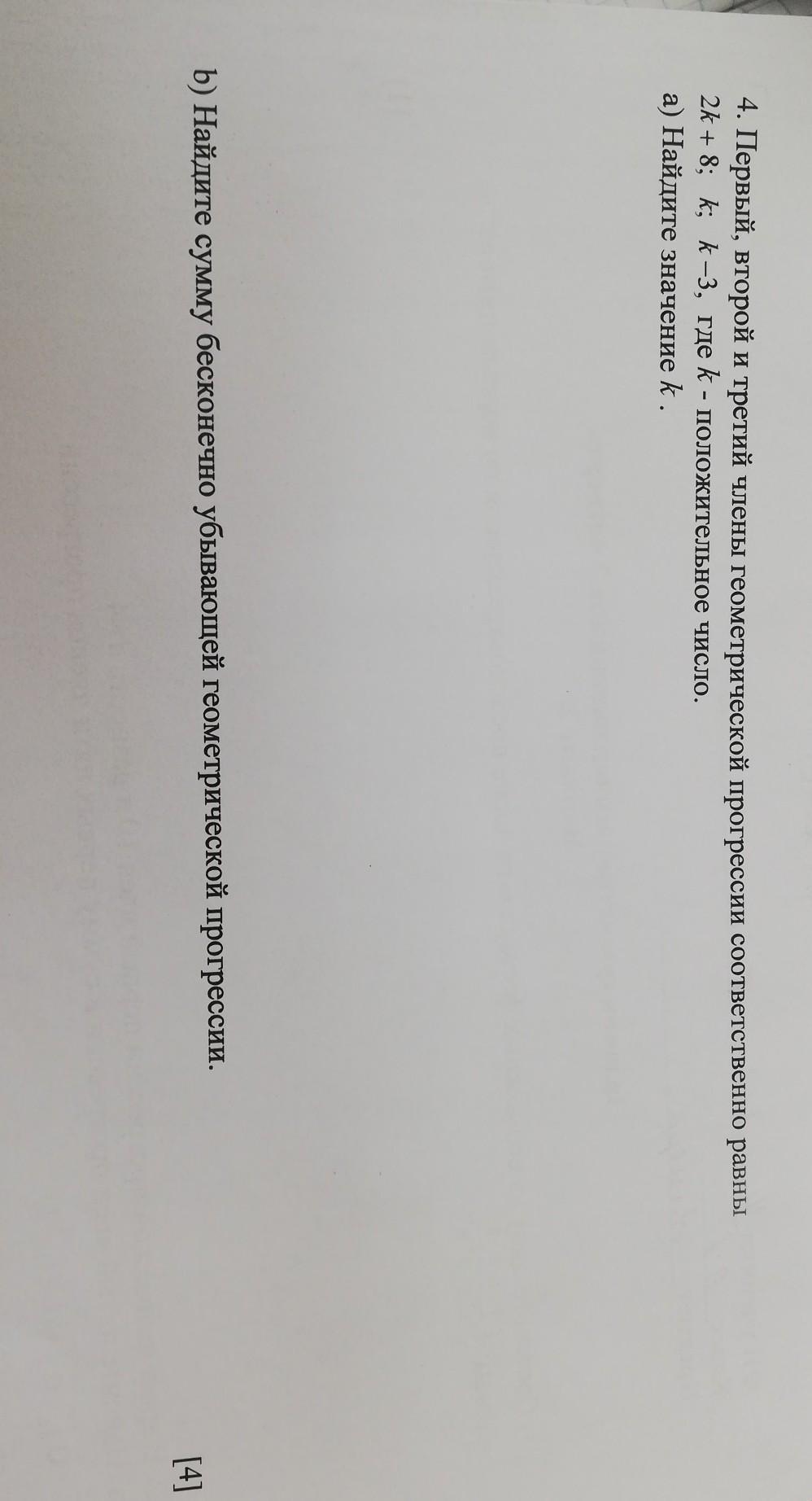 Это геометрическая прогрессия, где b₁=2k+8, b₂=k, b₃=k-3, следовательно, k можно найти из следующего уравнения: