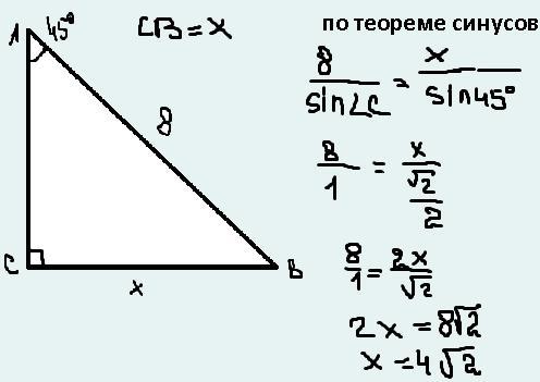 в прямоугольном треугольнитке ABC гипотенуза AB равен 8 см, а угол A равен 45°C. Найдите катет противолежащей углы A