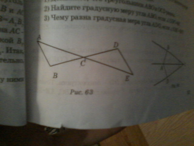 На рисунке 63 изображены треугольники BAC и DKC. Известно,что АС=СЕ,ВС= CD.Докажите,что угол АВС=углу CDE.