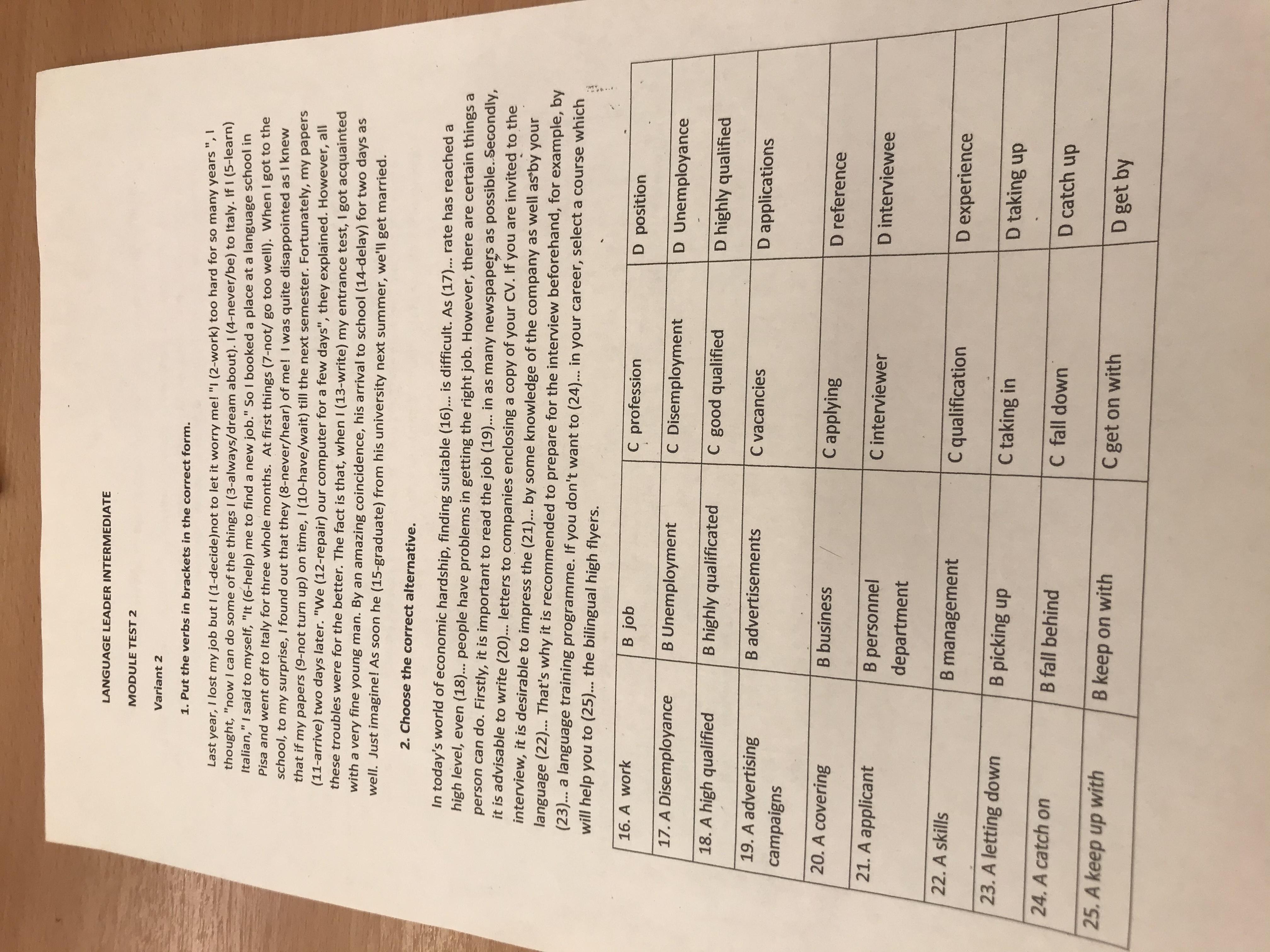 In today's world of economic hardship, finding suitable (16) B job is difficult. As (17) B unemployment rate has reached a high level, even (18) D highly qualified people have problems in getting the right job. However, there are certain things a person can do. Firstly, it is important to read the job (19) B advertisements in as many newspapers as possible. Secondly, it is advisable to write (20) A covering letters to companies enclosing a copy of your CV. If you are invited to the interview, it is desirable to impress the (21) C interviewer by some knowledge of the company as well as by your language (22) A skills. That's why it is recommended to prepare for the interview beforehand, for example, by (23) D taking up a language training programme. If you don't want to (24) B fall behind in your career, select a course which will help you to (25) A keep up with the bilingual high flyers.