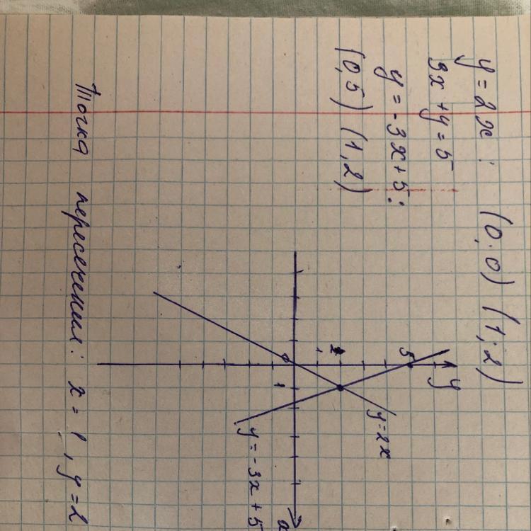 Ответ : x=1 y=2 - точка пересечения y=2x 3x+y=5