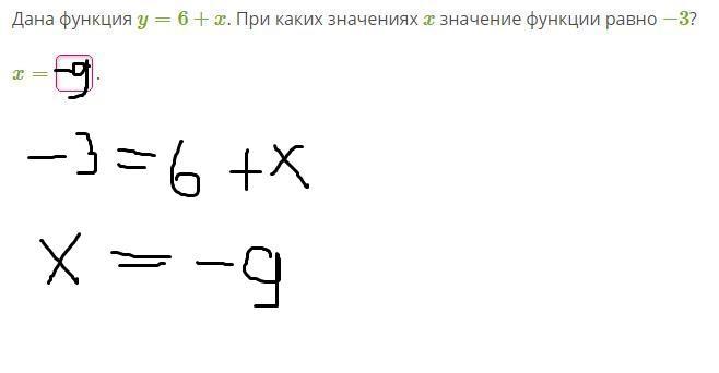 Дана функция y=6+x. При каких значениях x значение функции равно −3?