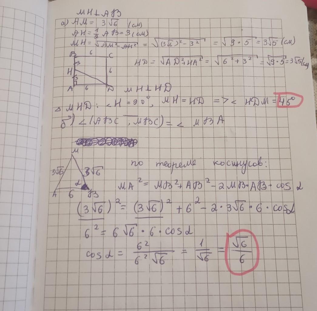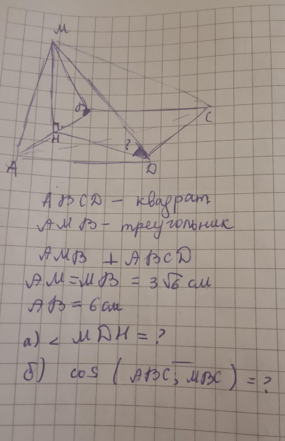 ABCD - квадрат со стороной, равной 6 см. Треугольник AMB имеет общую сторону AB с квадратом, AM=BM=3√6 см. Плоскости квадрата и треугольника взаимно перпендикулярны.