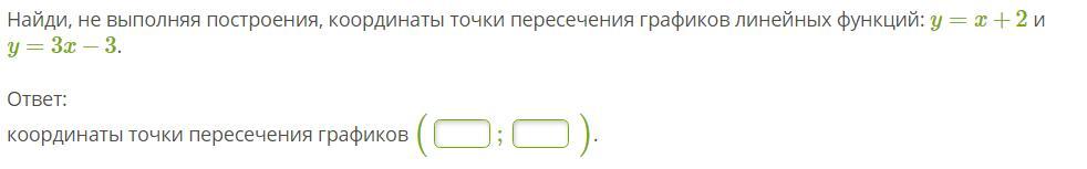 Найди, не выполняя построения, координаты точки пересечения графиков линейных функций: y=x+2 и y=3x−3.