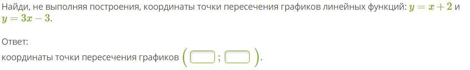 Найди, не выполняя построения, координаты точки пересечения графиков линейных функций: y=x+2 и y=3x−3.