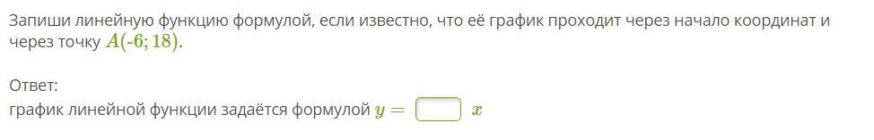 Запиши линейную функцию формулой, если известно, что её график проходит через начало координат и через точку A(-6;18).