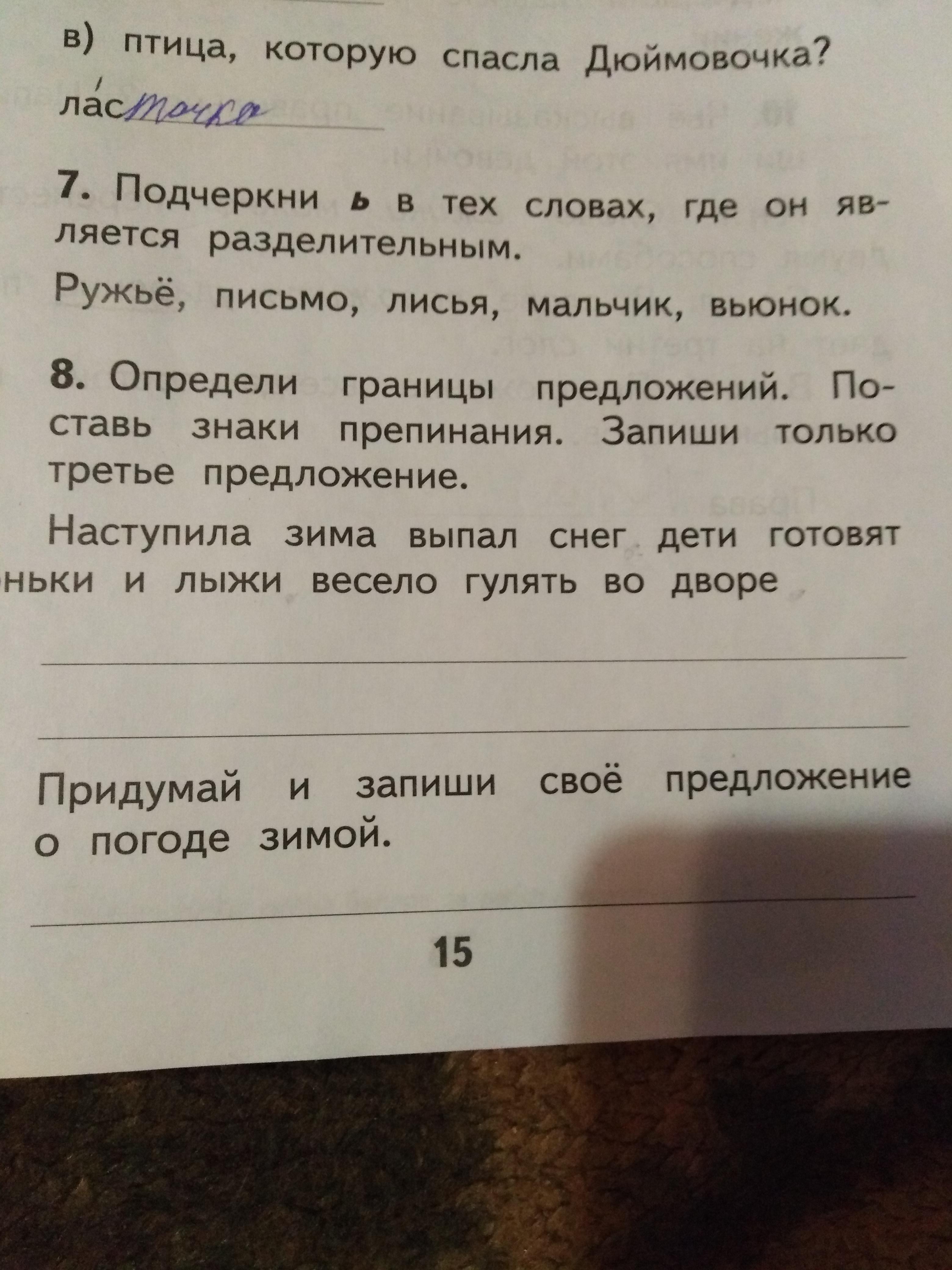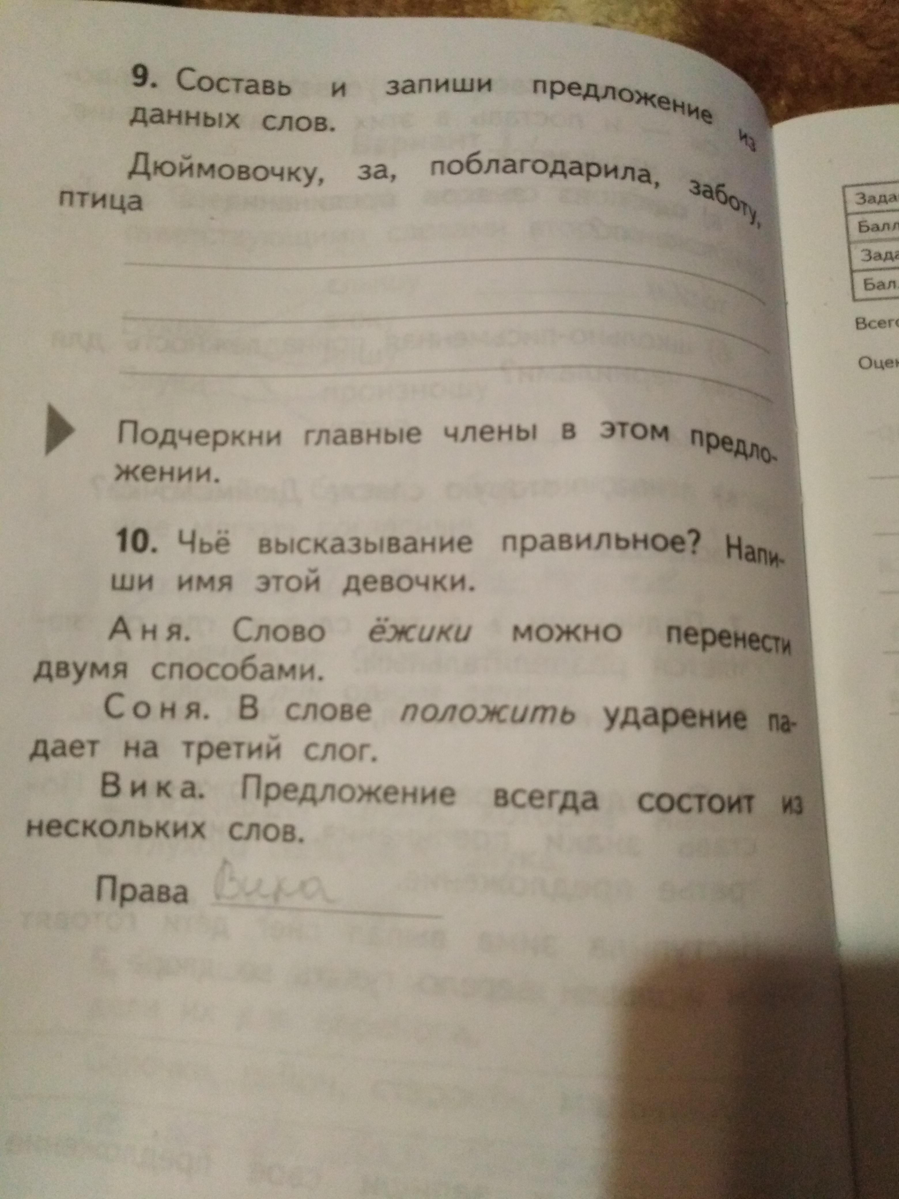 9.Птица поблагодарила Дюймовочку за заботу.( Птица одной чертой, а поблагодарила двумя.)