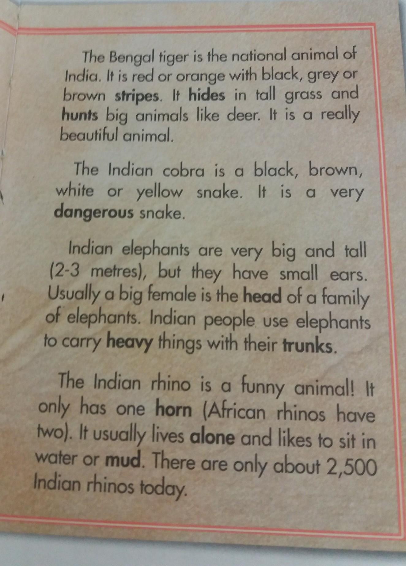 Объяснение:Бенгальский тигр - национальное животное Индии. Это красный или оранжевый с черными, серыми или коричневыми полосами. Он прячется в высокой траве и охотится на крупных животных, таких как олень. Это действительно красивое животное. Индийская кобра - черная, коричневая, белая или желтая змея. Это очень опасная змея. Индийские слоны очень большие и высокие (2-3 метра), но у них маленькие уши. Обычно большая самка является главой семьи слонов. Индийские люди используют слонов, чтобы нести тяжелые вещи с их стволами. Индийский носорог - забавное животное! У него только один рог (у африканских носорогов есть два). Обычно он живет один и любит сидеть в воде или грязи. Сегодня только около 2500 индийских носорогов.