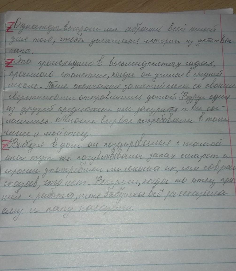 после "годах", 2 абзац запятая не нужна.2 абзац "после окончания занятий "-запятая. 2 аб"Вдруг ,один из друзей предложил им закурить,и все согласились. -запятые."Многие впервые попробовали, в том числе и мой отец."-запятая. 3 абзац "Войдя в дом ,он поздоровался с мамой,она тут же почувствовала запах сигарет. Она спросила юношу, употреблял ли он их,он соврал. "-я немного откорректировала твою работу, слова неправильно сформулированы. 3 аб ,последнее предложение "рассказала ему ,и пару наказали" -запятая.