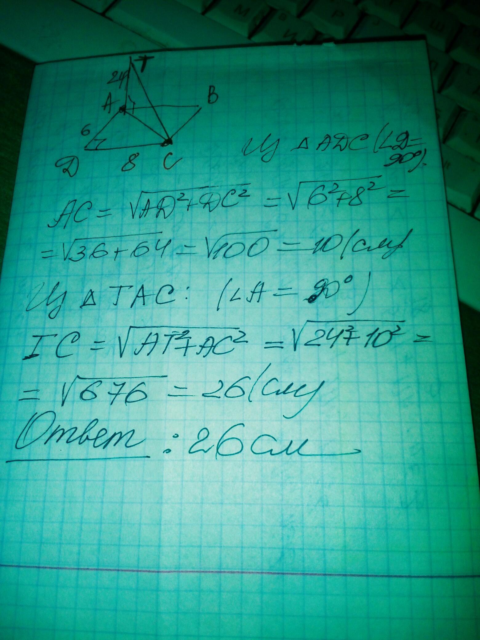 Із точки до площини прямокутника зі сторонами 6см і 8 см проведено перпендикуляр довжиною 24 см.Основа перпендикуляра -вершина одного із кутів прямокутника.Знайдіть відстань від даної точки до протилежної вершини прямокутника