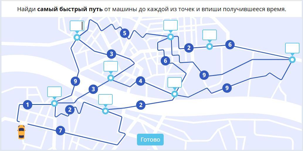 Найди самый быстрый путь от машины до каждой из точек и впиши получившееся время ( СКРИНШОТ ! )