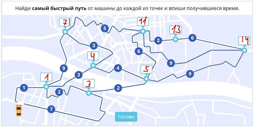 Найди самый быстрый путь от машины до каждой из точек и впиши получившееся время ( СКРИНШОТ ! )