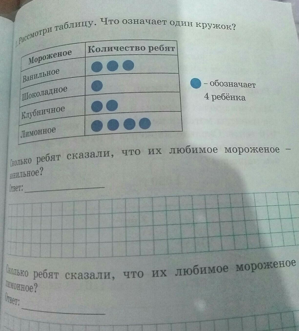 Один кружок обозначает 4 человека.Так как кружка в таблице с ванильным мороженным 3,то значит нужно сложить 3 раза по 4.Получаем ответ:12 ребят сказали, что их любимое мороженое-ванильное.