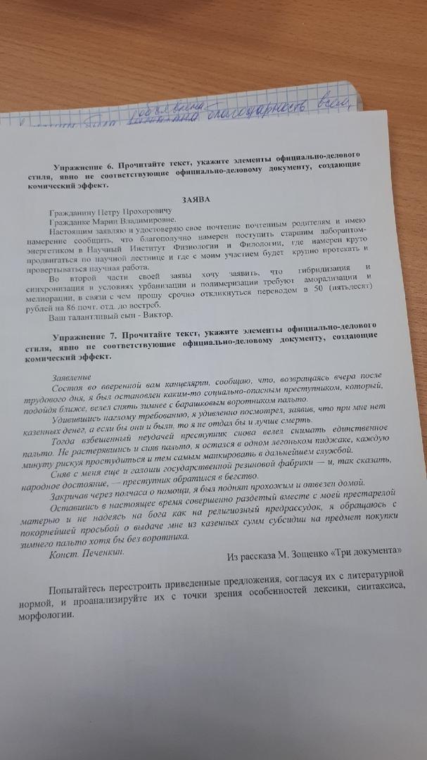 Ответ:упражнение шесть В первую очередь комический эффект создается благодаря несоответствию темы письма и претензии на официально-деловой стиль. А также из-за: повторений одних и тех же слов:"Имею намерение сообщить, что благополучно намерен поступить","Во второй части своей заявы хочу заявить", употреблению слова,не подходящих для данного стиля - заява.А также черезмерным употреблением так называемых" заумных" слов:урбанизация, синхронизация и так далее.