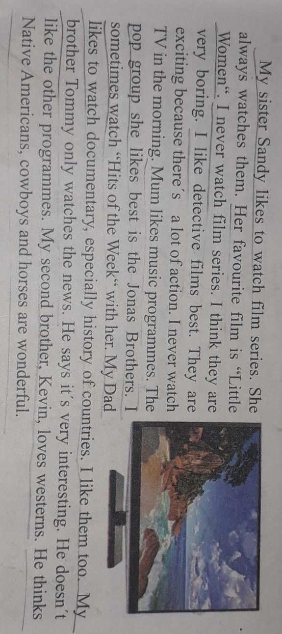 Моя сестра Сэнди любит смотреть сериалы. Она всегда смотрит их. Ее любимый фильм «Маленькие женщины». Я никогда не смотрю сериалы. Я думаю, что они очень скучные. Мне больше всего нравятся детективные фильмы. Они захватывающие, потому что здесь много экшена. Я никогда не смотрю телевизор по утрам. Мама любит музыкальные программы. Поп-группа, которая ей нравится больше всего, это Jonas Brothers. Я иногда смотрю с ней «Хиты недели». Мой папа любит смотреть документальные фильмы, особенно историю стран. Они мне тоже нравятся. Мой брат Томми только смотрит новости. говорит, что это очень интересно. Ему не нравятся другие программы. Мой второй брат, Кевин, любит вестерны. Он думает, что коренные американцы, ковбои и лошади замечательные. (