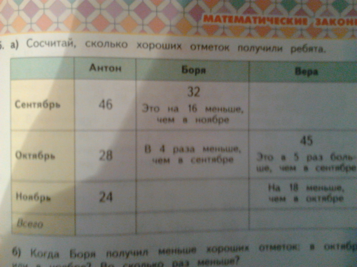 а) Сосчитай , сколько хороших отметок получили ребята . б) Когда Боря получил меньше хороших отметок : в октябре или в ноябре? Во сколько раз меньше? в) Когда Вера получила больше хороших отметок : в сентябре или в ноябре ? Во сколько раз больше ?