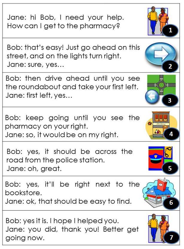 Джейн: привіт Боб, мені потрібна твоя допомога. Як я можу потрапити в аптеку? Боб: це просто! Просто продовжуйте цю вулицю, а на вогні поверніть праворуч. Джейн: впевнено, так ... 2 Боб: потім їдьте вперед, поки не побачите кільцеву дорогу і спершу виїдете ліворуч. Джейн: спочатку зліва, так ... 3 Боб: продовжуй рухатись, поки не побачиш аптеку праворуч. Джейн: так, це було б праворуч від мене. 4 Боб: так, це повинно бути через дорогу від відділення поліції. Джейн: о, чудово. Боб: так, це буде прямо біля книгарні. Джейн: гаразд, це легко знайти. Боб: так. сподіваюся, що я вам допомогла. Джейн: ти зробив, дякую! Краще йдіть зараз.