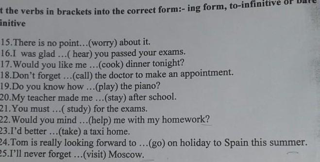 Put the verbs in brackets into the correct form: - ins form, to-infinitive or bare infinitive