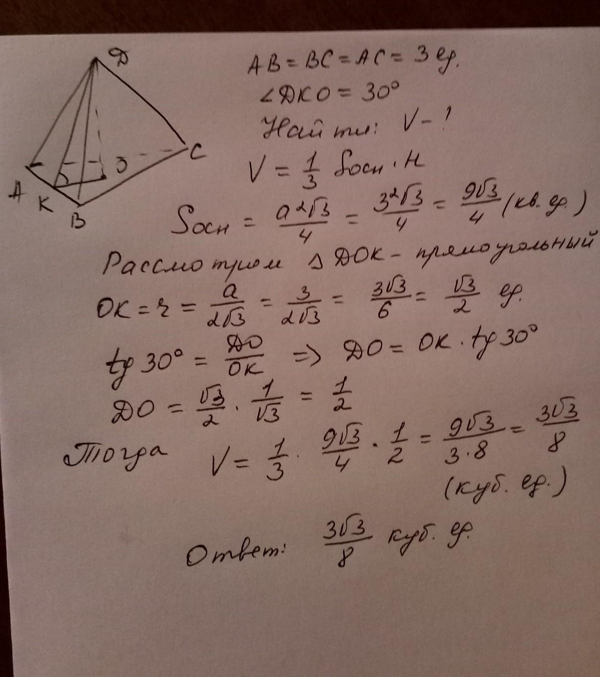 Сторона основания правильной треугольной пирамиды равна 3, двугранный угол при ребре основания равен 30°.
