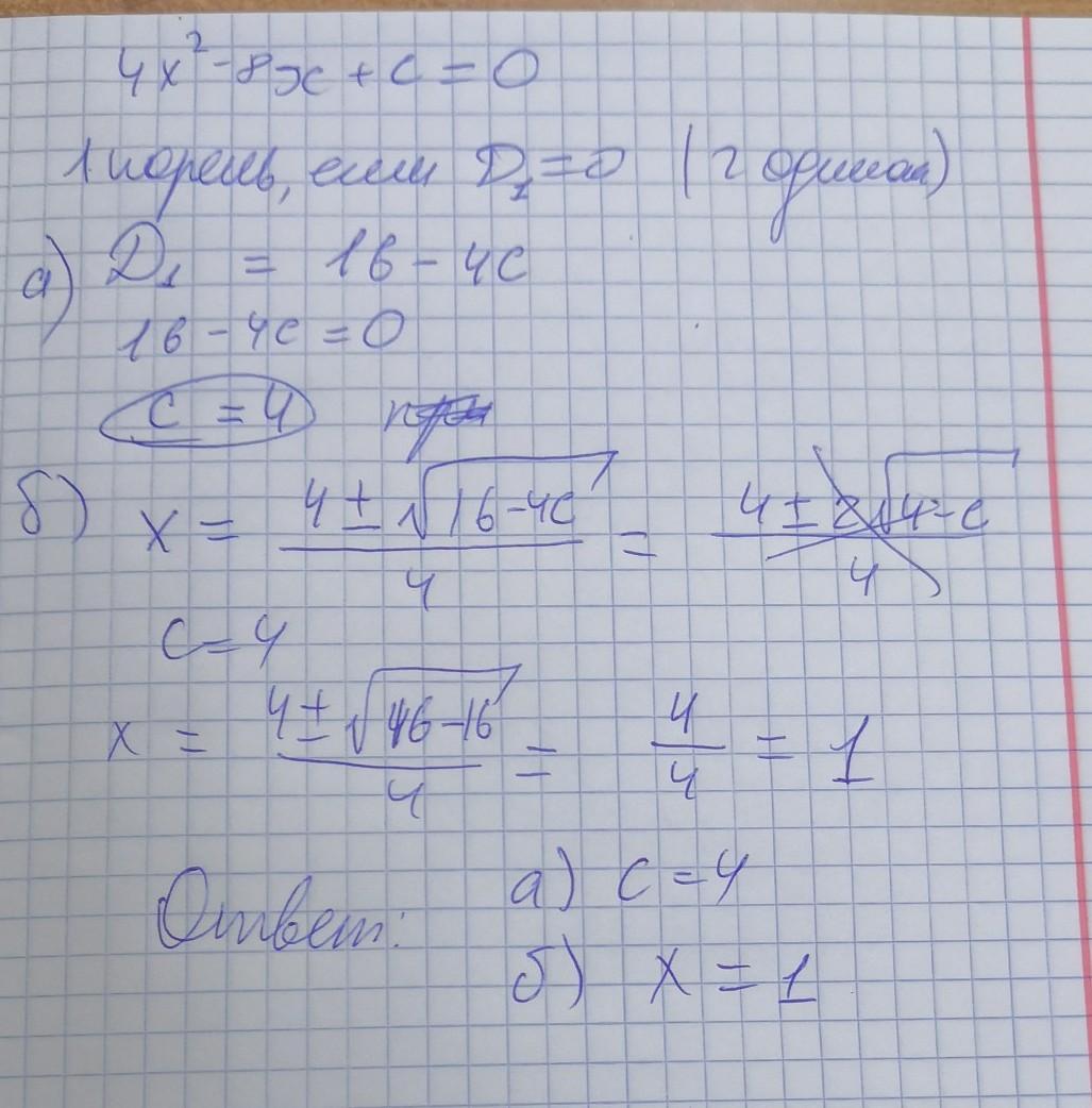 Дано квадратное уравнение 4х^2 – 8x + c = 0.