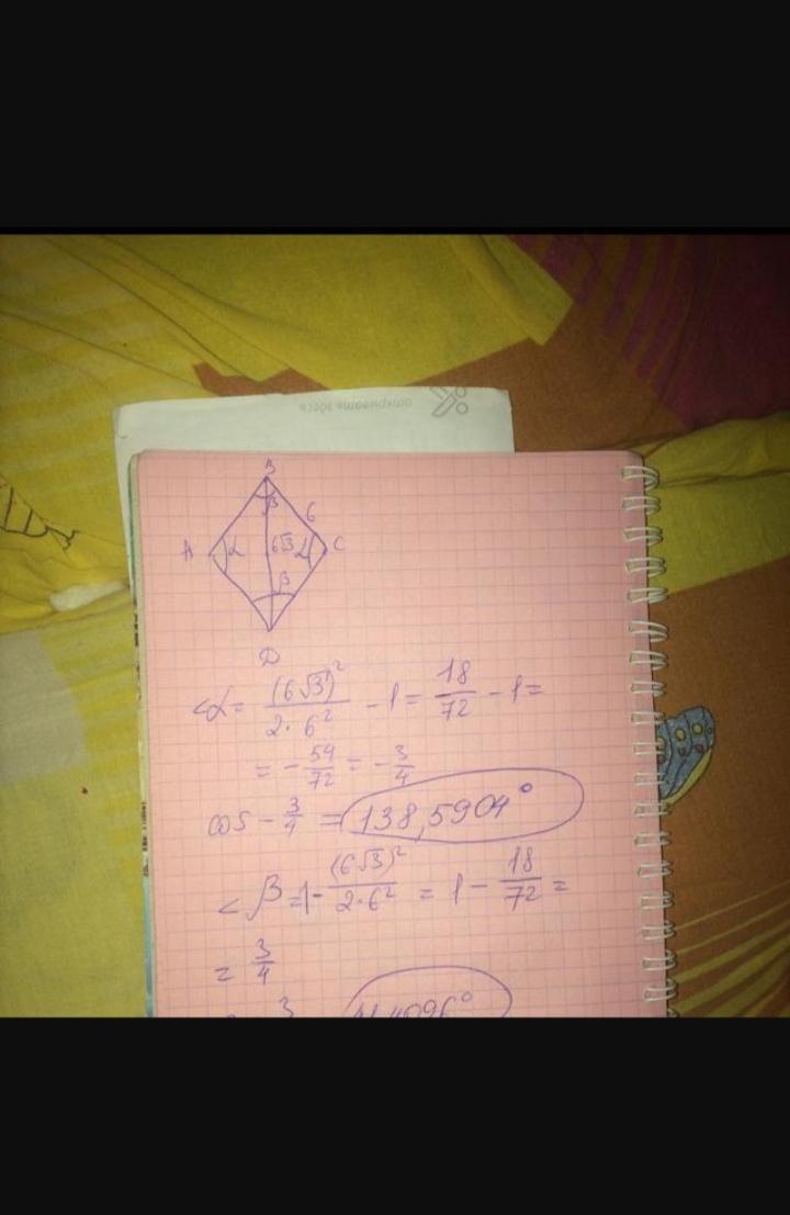 Найдите углы ромба АВСD,если его сторона ровна 6см , а большая диогональ 6√3см СРОЧНО 20БАЛОВ