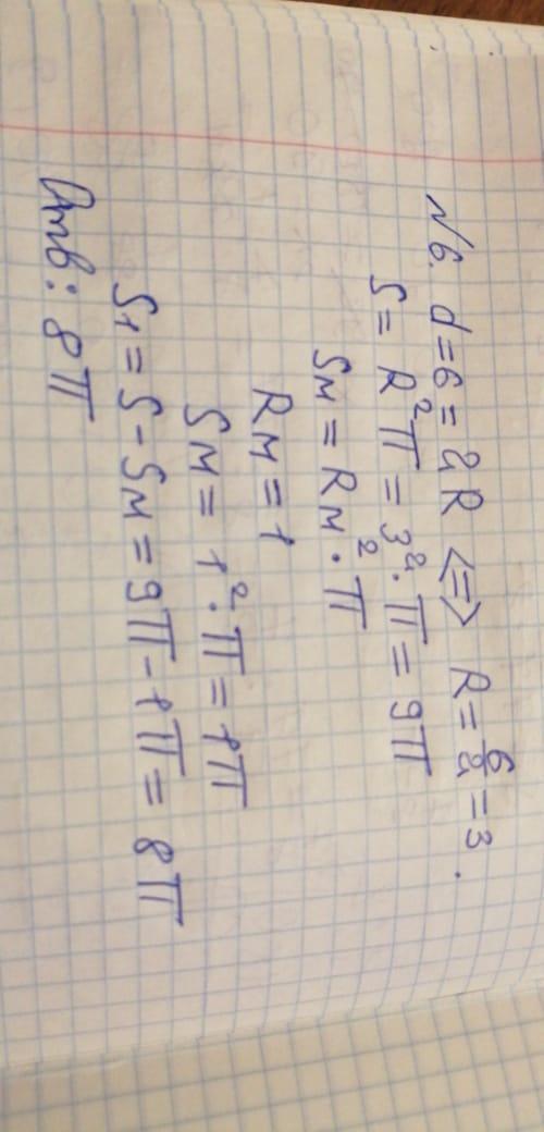 №6. d=6, R=3. S=9π (полный круг). (Rm=1, Sm=1π - малый белый круг). S закрашенной фигуры = S-Sm=9π-1π=8π см²