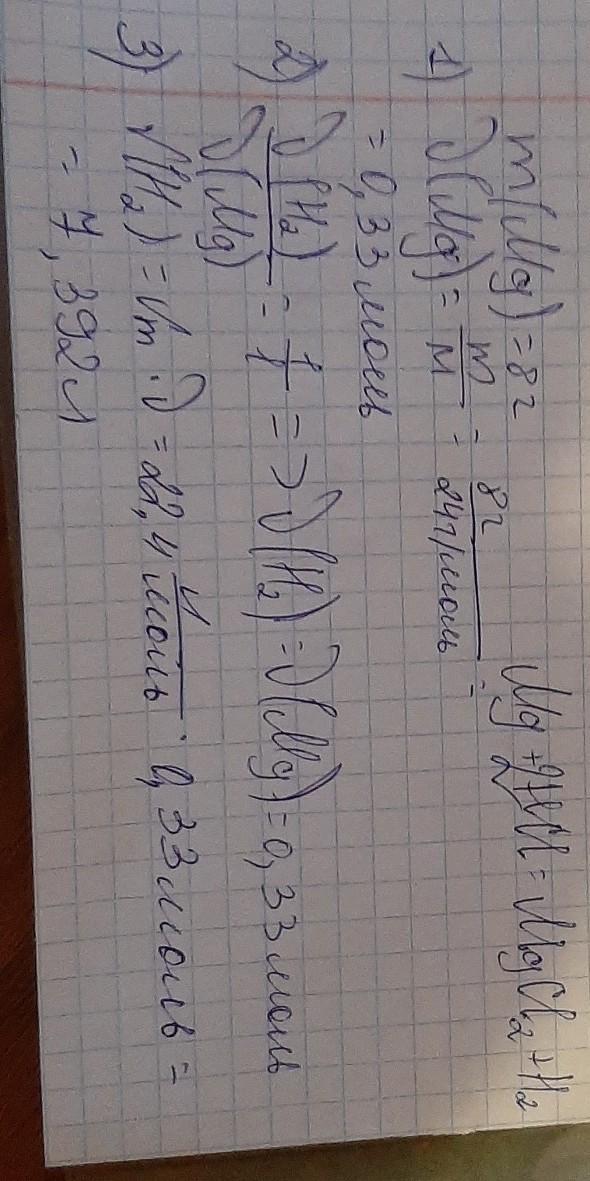 Какой объем водорода при нормальных условиях выделится при действии магния массой 8г на соляную кислоту