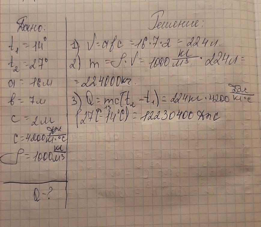 Определи, какое количество теплоты пойдёт на нагревание воды от 14°C до 27°C в бассейне, длина которого — 16 м, ширина — 7 м и глубина — 2 м. Удельная теплоёмкость воды равна 4200 Дж/(кг·°C), плотность воды — 1000 кг/м³.