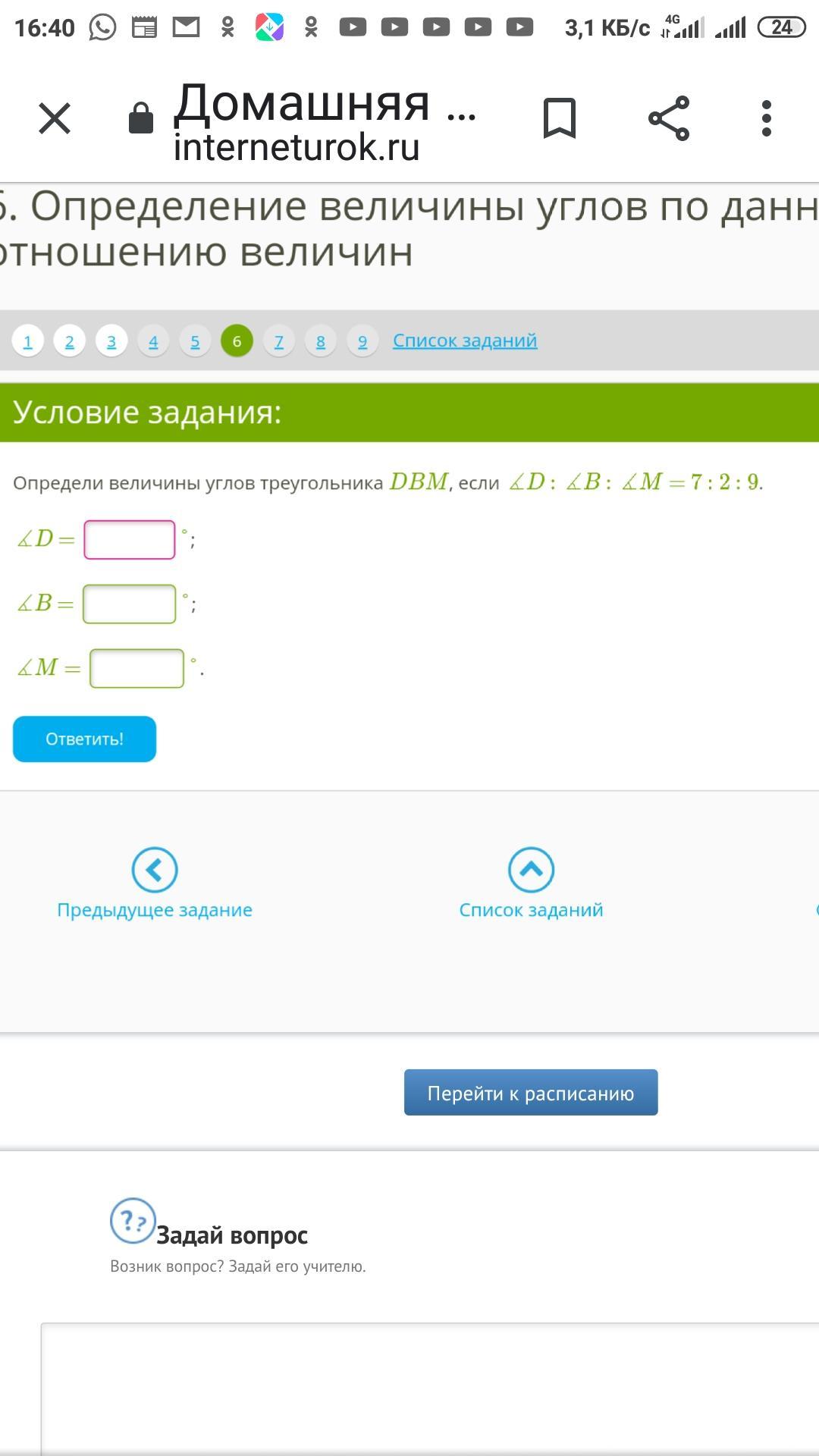 ⇒∠D=10°*7=70°; ∠B=10°*2=20°; ∠M=10°*9=90°