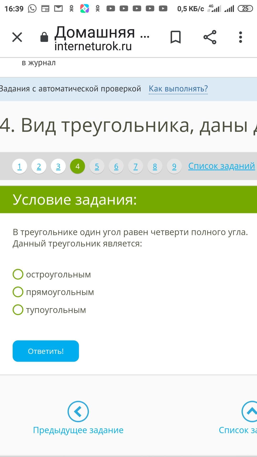 4. Четверть полного угла = 360°:4=90°⇒Δпрямоугольный