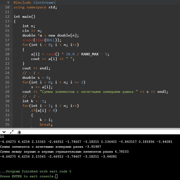 cout << "Сумма между первым и первым отрицательным элементом равна "