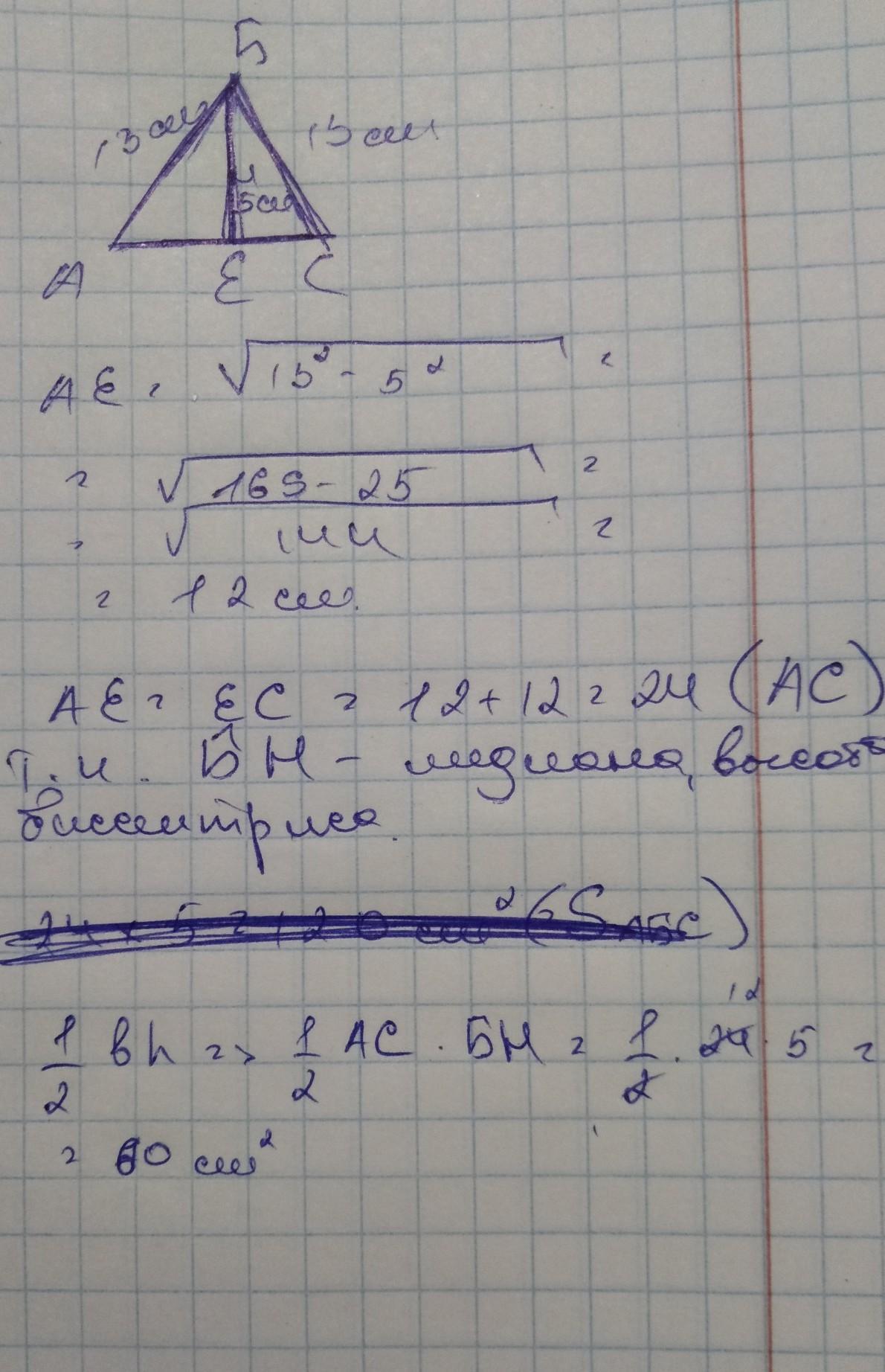 1.Дан равнобедренный треугольник АБС. АБ равна 13 см,БН высота которая равна 5 см. Найти площадь (по теореме Пифагора)