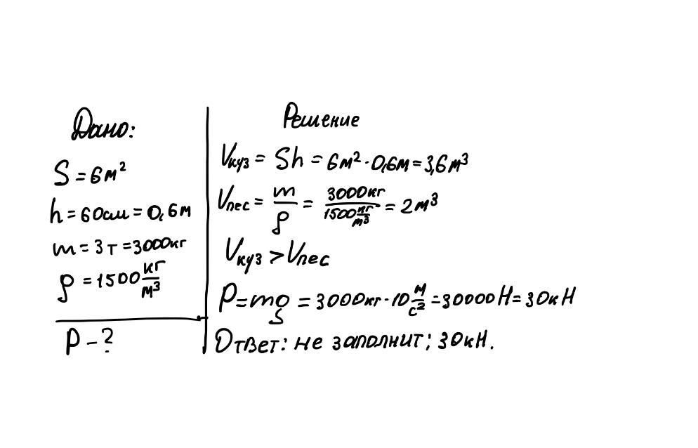 Кузов грузовой автомашины имеет площадь 6м кв и высоту 60 см. Заполнится ли полностью кузов машины, если погрузить 3т песка, плотностью которого 1500кг/м куб. Чему равен вес песка?