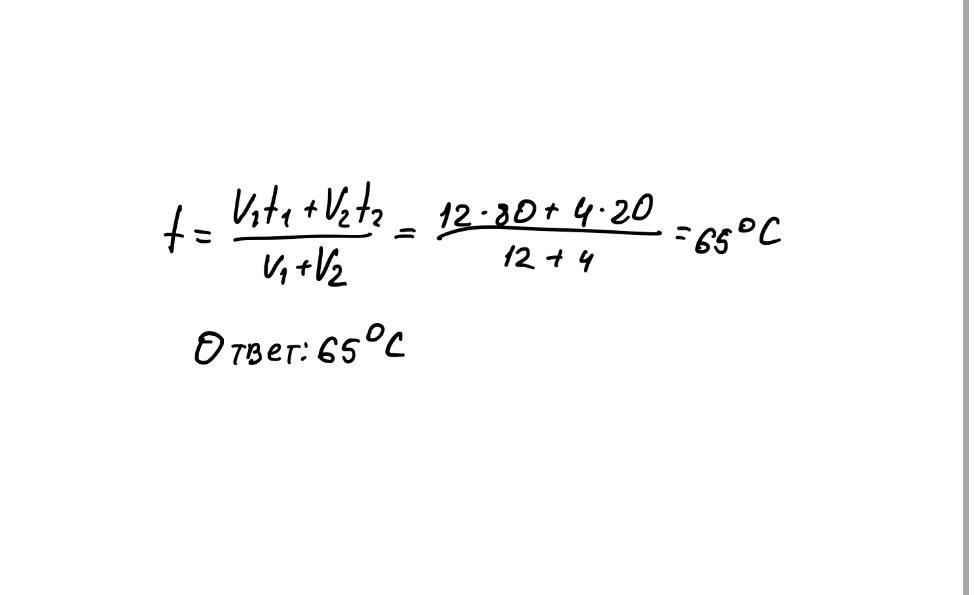 12 литров воды при температуре 80 гр , смешали с 4 литрами воды при температуре 20 гр. Найти температуру получившейся смеси.