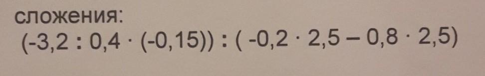 (-3,2 : 0,4 • (-0,15)) : (-0,2 • 2,5 - 0,8 • 2,5)