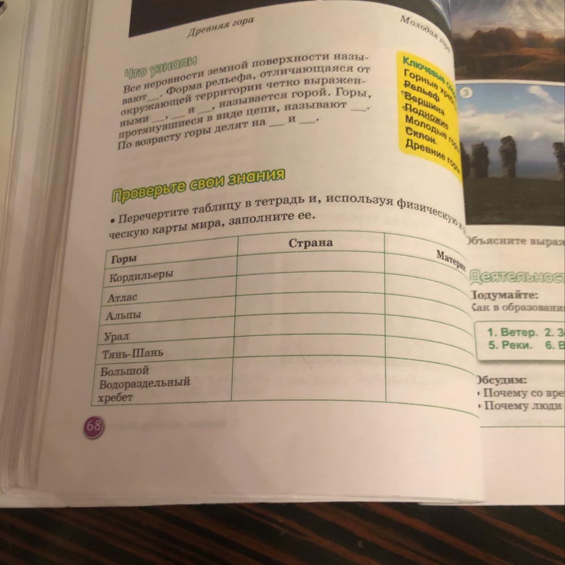 Тянь-Шань:(страны)Киргизия,Китай,Казахстан,Таджикистан,Узбекистан(материк)Азия.