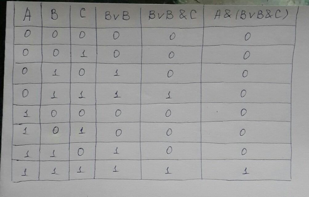 Всего в выражении 3 переменные => в таблице истинности будет 2³ = 8 строк, не считая строку-заголовок.